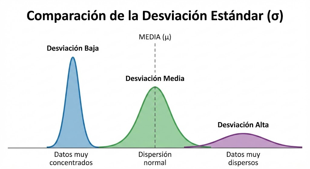 - Desviación Estándar: ¿Qué tan lejos están los datos del centro? (Ancho).