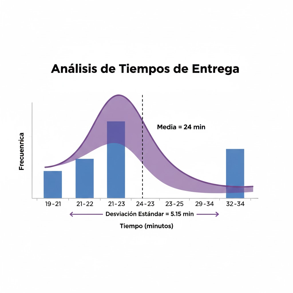 Señor dueño, su promedio es bueno, pero su proceso es impredecible. Tiene pocos pedidos cerca del promedio y demasiada variabilidad. Ese pedido de 33 minutos está arruinando su consistencia y aplanando su curva de calidad.
