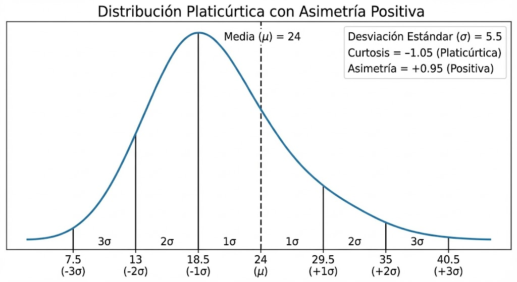 - La Media Desplazada: Nota que la Media (24) no está en el pico más alto, sino que está “arrastrada” hacia la derecha por el valor de 33. Esto es lo que llamamos Sesgo Positivo.